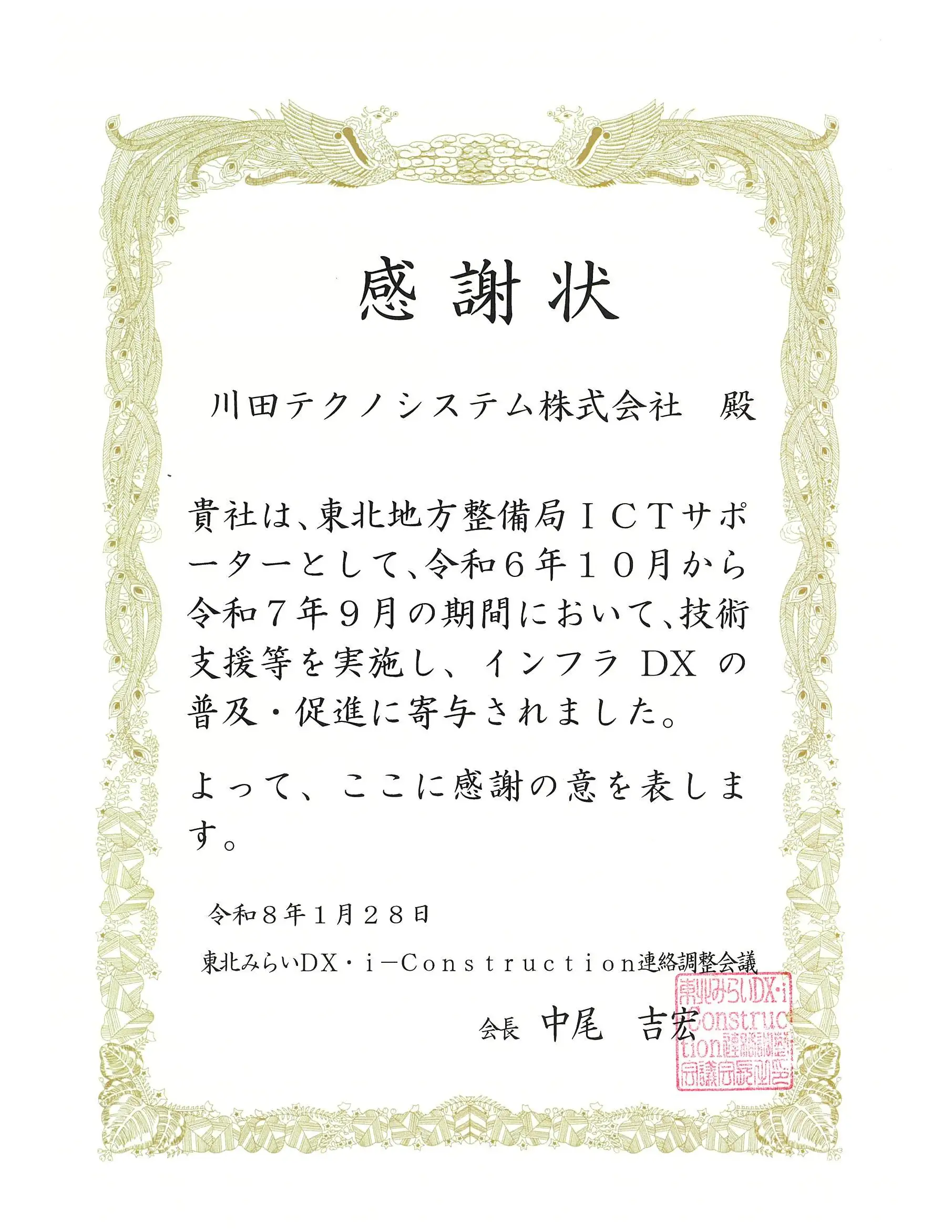 東北地方整備局より、2年連続で「ICTサポーター感謝状」を頂きました