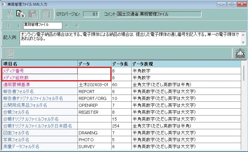 業務管理ファイル(INDEX_D.XML)や工事管理ファイル(INDEX_C.XML)・写真管理ファイル(PHOTO.XML)内の、「メディア番号」と「メディア総枚数」は、電納ヘルパーがイメージ作成時に自動的に入力します。